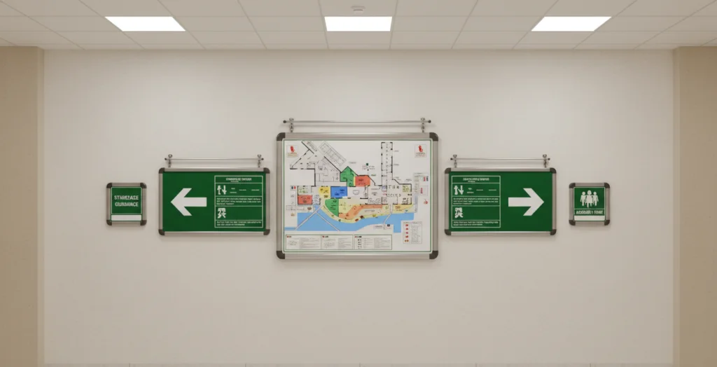 Fire escape route boards provide a clear visual map of evacuation routes.