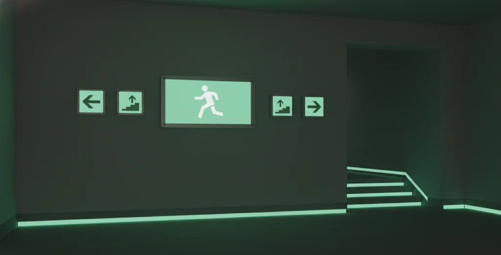 Photoluminescent glow signs absorb ambient light and glow in darkness, ensuring visibility even during complete power failure.