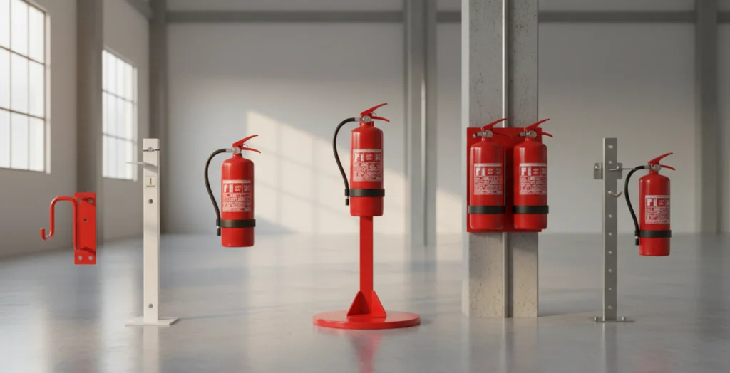 Stands and brackets ensure safe and visible placement of fire extinguishers.