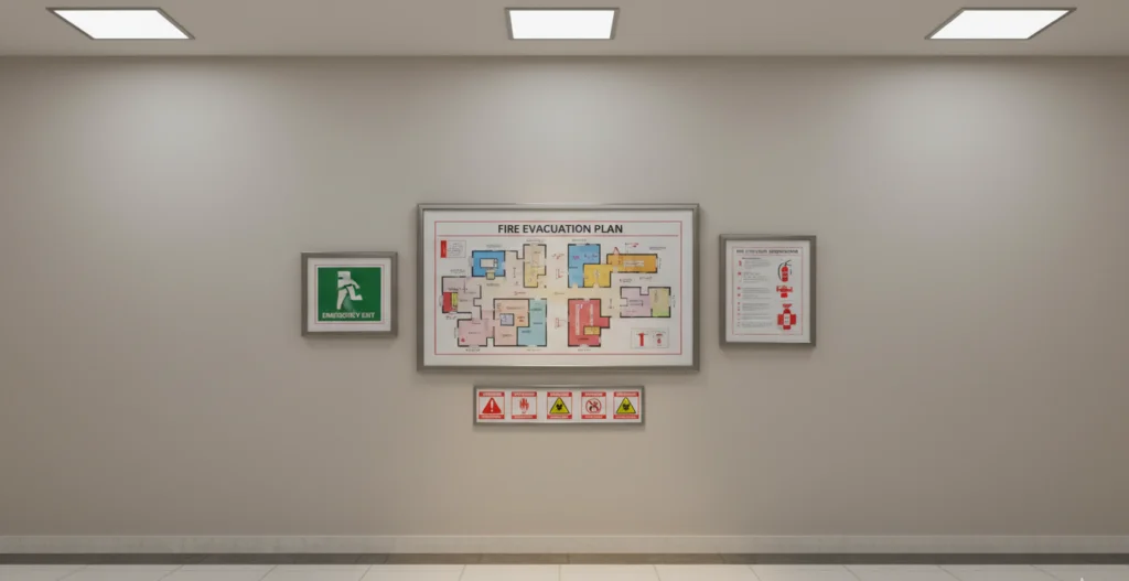 Safety posters and labels raise awareness and guide occupants during emergencies.