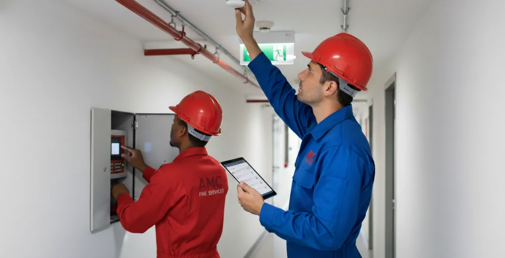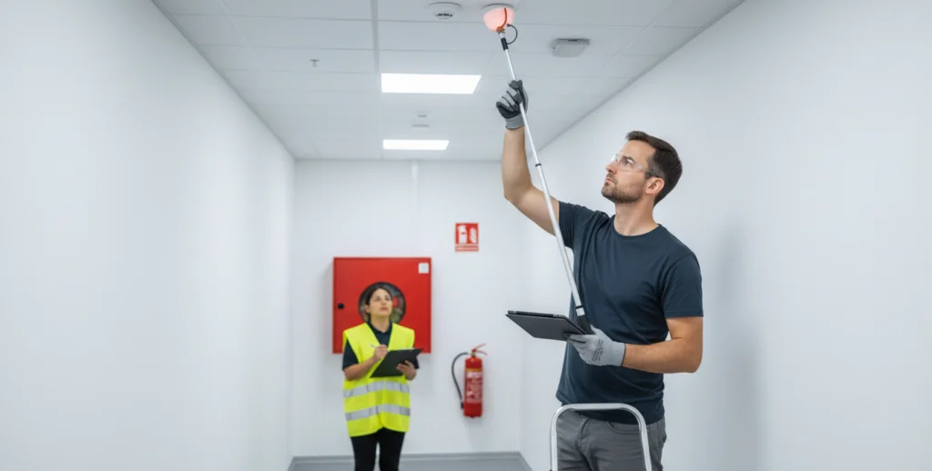 • Checking integration with sprinklers, emergency lights, and suppression systems